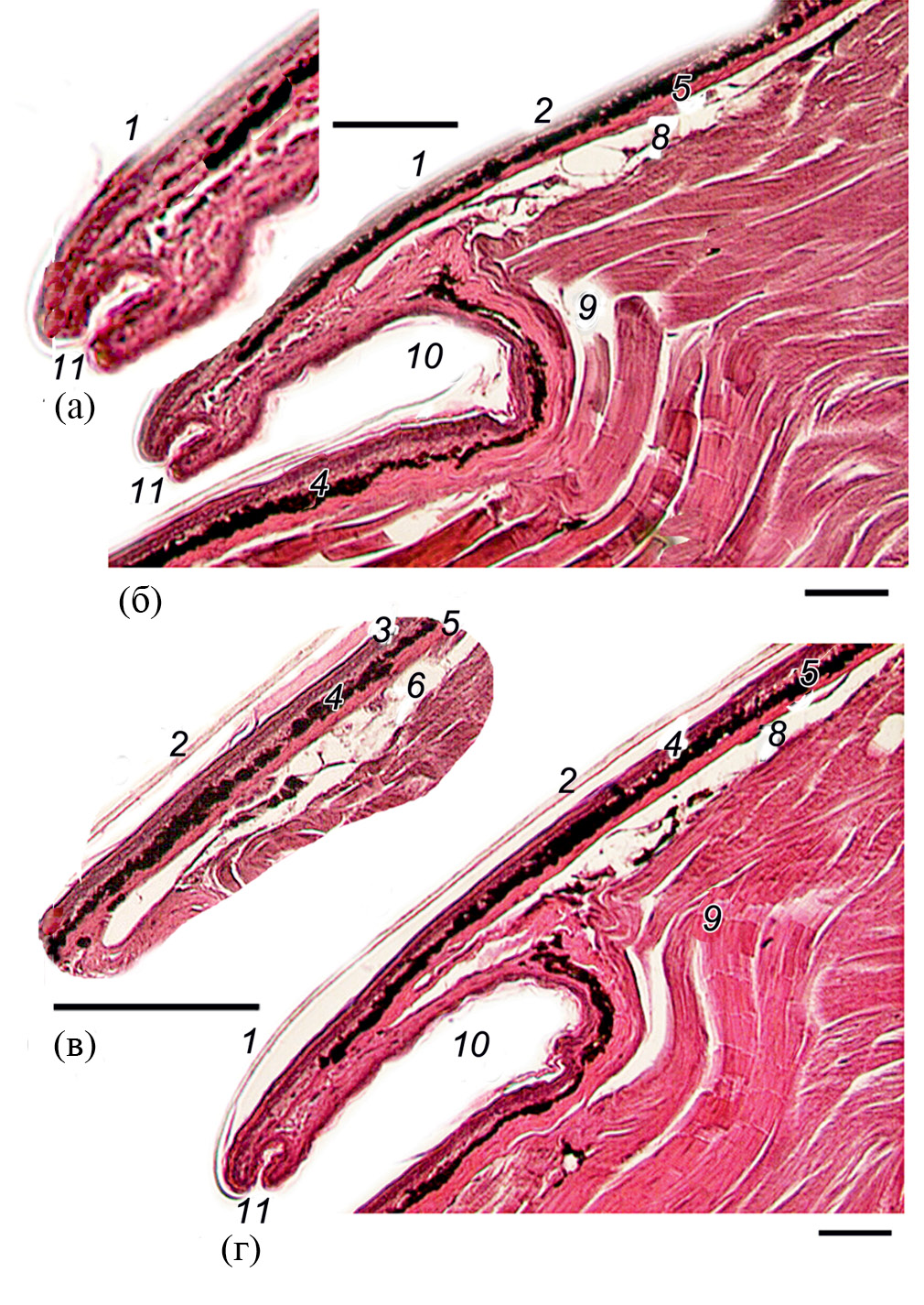 Рис. 3. Микроструктура брюшных щитков взрослой особи Darevskia dahli на сагиттальных срезах. Продольная кожная складка на вентральной поверхности чешуи, образующая незамкнутую трубку (а). Общий вид (б, г). Лакуны подкожной клетчатки, залегающие под дермальным слоем (в). Обозначения как на рис. 2, 11 – открытая полость трубчатой складки. Окраска гематокcилин-эозином. Микрофото. Масштаб 20 мкм.