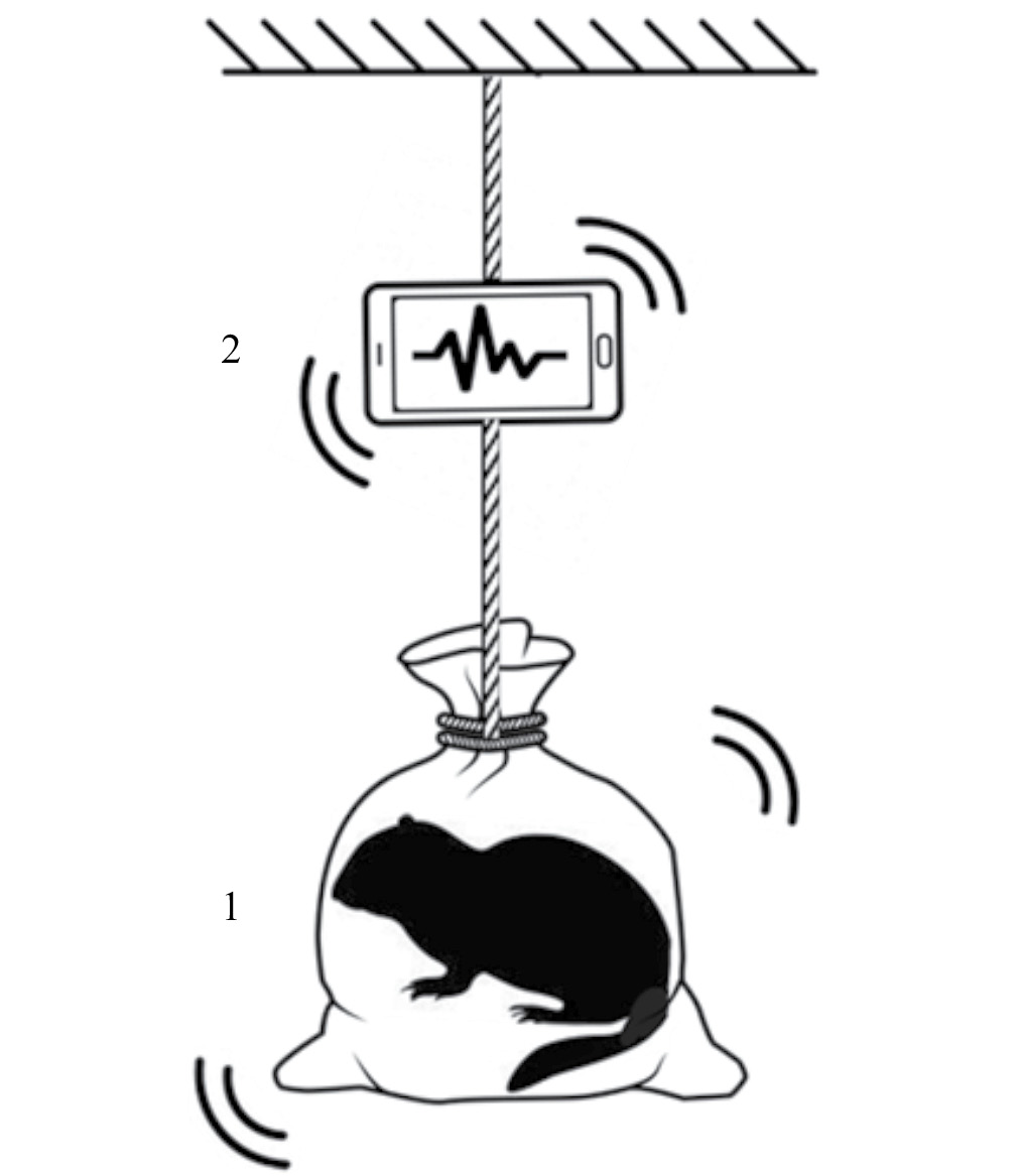 Тест 2, на интенсивность движения. Этот тест представлял собой альтернативный вариант теста на покорность с количественной оценкой интенсивности движений зверька. Тест 2 проводили после Теста 1. Тканевый мешок со зверьком подвешивали на пружине к пластиковому держателю, на котором был расположен акселерометр; держатель был закреплен на неподвижной опоре (рис. 1). Акселерометр регистрировал в течение 60 сек амплитуду движений зверька в мешке. Роль акселерометра выполнял смартфон с установленным на нем приложением Physics Toolbox Accelerometer для Android. Данные, полученные с акселерометра, представляли собой абсолютное ускорение по трем координатным осям в трехмерном пространстве, которое регистрировалось с частотой 200 раз в секунду. Поскольку даже в том случае, когда визуально суслик был неподвижен, акселерометр регистрировал фоновое движение («шум»), мы для каждого теста вводили поправку: выбирали отрезок записи продолжительностью в несколько секунд, когда зверек не производил видимых движений, для этого отрезка рассчитывали среднее ускорение и затем изо всех значений ускорения для данного теста вычитали это значение. Далее все значения ускорения суммировали и получали кумулятивную оценку интенсивности движений зверька за все время теста. Тест 2 проводили только в безветренную погоду; всего было проведено 53 теста с детенышами: 33 для самок (для 26 особей) и 20 для самцов (17 особей). Средний возраст зверьков составлял 28.3 ± 17.5 дней от первого выхода из норы (разброс составил от 1 до 60 дней). Также было проведено 7 тестов на интенсивность движения со взрослыми особями в те же даты.