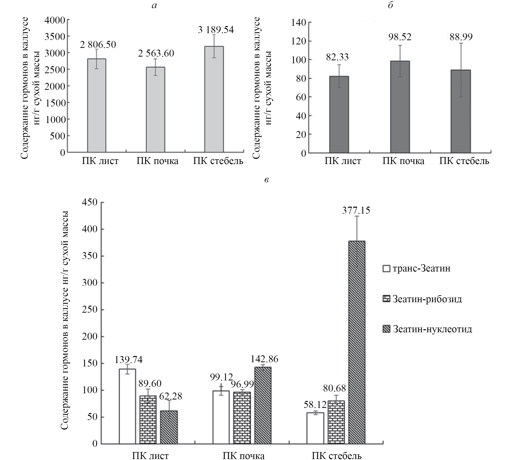 Первичные каллусы L. angustifolia формировались на поверхности различных эксплантов через 2–3 недели после введения в культуру in vitro на питательную среду. По морфологическим показателям первичные каллусы представляли собой рыхлые недифференцированные образования со множеством инвагинаций, как это показано на примере таких каллусов, полученных из сегментов листа (рис. 1б). Результаты выявления содержания эндогенных ИУК, АБК и цитокининов в первичных каллусах представлены на рис. 3. Их анализ свидетельствует о примерно равных уровнях ИУК (2806.50 нг/г, 2563.60 нг/г, 3189.54 нг/г) и АБК (82.33 нг/г, 98.52 нг/г, 88.99 нг/г) в каллусах, полученных из различных эксплантов (лист, почка, стебель, соответственно). В то же время выявлено значительное повышение показателя цитокинина зеатин-нуклеотида в каллусах, полученных из сегментов стеблей (377.15 нг/г), в сравнении с аналогичными показателями в каллусах, полученных из сегментов почек (142.86 нг/г) и особенно сегментов листьев (62.28/ нг/г).