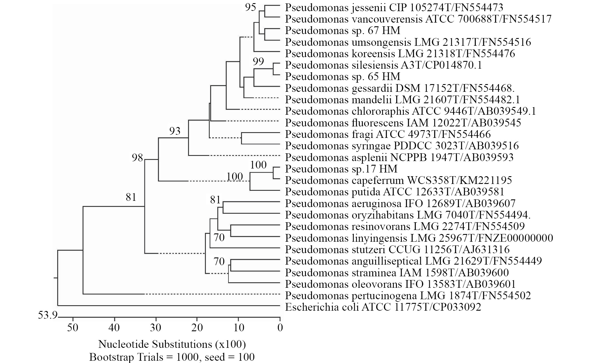 По ранее полученным данным сравнительного анализа генов 16S рРНК и rpoD род Pseudomonas можно разделить на три основные группы: Pseudomonas aeruginosa, Pseudomonas pertucinogena и Pseudomonas fluorescens (Lalucat et al., 2020; Girard et al., 2020). Секвенирование вышеуказанных генов выявило, что штаммы Pseudomonas sp. 17 HM, 65 HM и 67 HM с большой вероятностью можно отнести к видам P. capeferrum, P. silesiensis, P. umsongensis, соответственно, которые входят в группу P. fluorescens. Сообщалось, что представители данных видов в большинстве случаев были выделены из почв и многие из них обладали свойствами PGPR бактерий, а также способностью к биоаккумуляции и биодеградации загрязняющих веществ (Berendsen et al., 2015; Kaminski et al., 2018; Narancic et al., 2021).