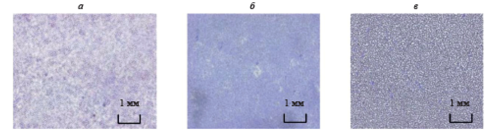 Рис. 3. Биопленки, образуемые штаммами Pseudomonas sp. на поверхности планшета через 7 дней культивирования: а – Pseudomonas sp. 17 НМ, среда LB; б – Pseudomonas sp. 65 НМ, среда YM; в – Pseudomonas sp. 67 НМ, среда MH.
