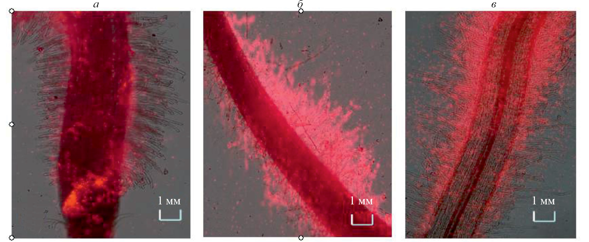 Визуальное наблюдение меченых микроорганизмов на корнях растений проводили на флуоресцентном микроскопе AxioImagerM1 (“CarlZeiss”, Германия).