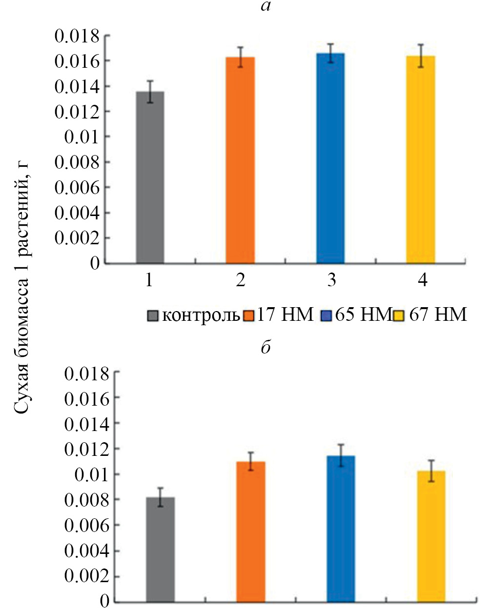 В нашем исследовании обработка семян люцерны посевной штаммами Pseudomonas sp. 17 HM, 65 HM, 67 HM в нормальных условиях приводила к прибавке сухой массы в 20–22% относительно контрольных, необработанных растений (рис. 6а).