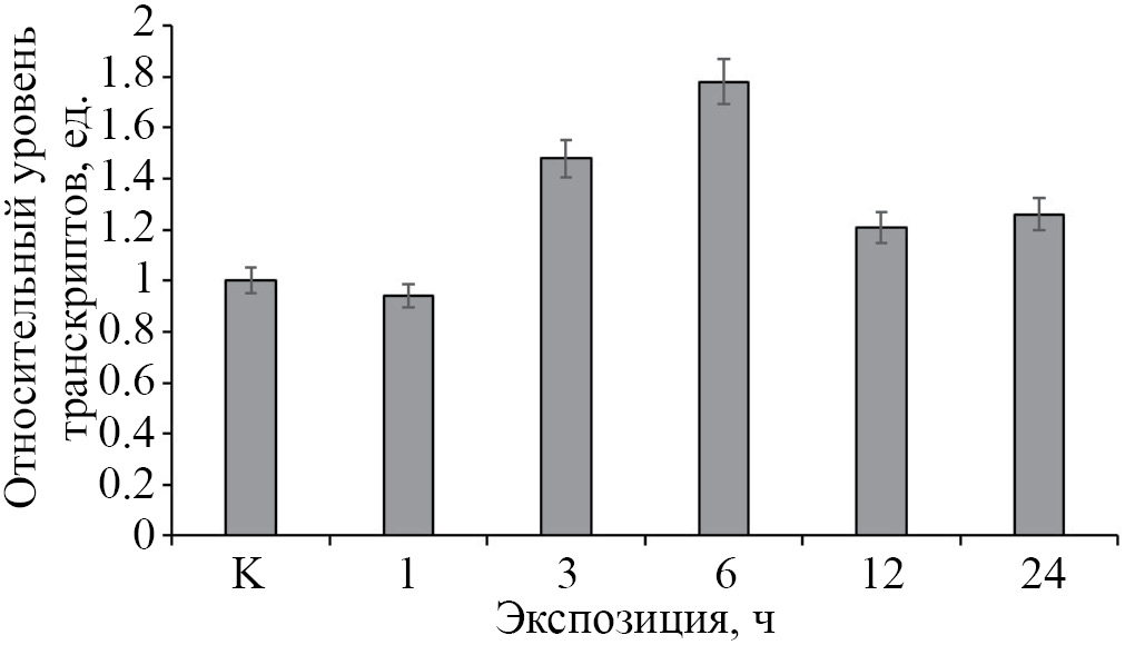 Незначительное уменьшение транскрипционной активности гена GDH-1(5D) наблюдалось на 6 и 12 часы эксперимента (рис. 5), когда уменьшение содержания его мРНК в листьях пшеницы при солевом стрессе на 6 и 12 час экспозиции составило 5−7% от контрольных значений.