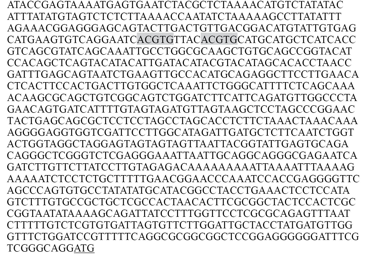 Рис. 6. Последовательность промотора гена GDH-1(5А) с обозначением специфического сайта посадки транскрипционного фактора ответа HIF-1 (фактор ответа на гипоксию) (выделено серым). Стартовый кодон ATG выделен подчеркиванием.
