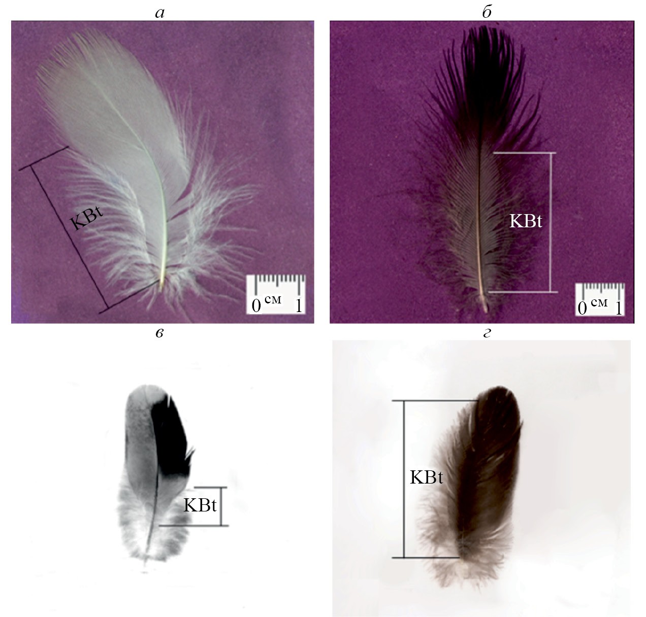Рис. 1. Комбинированные бородки с типичными пуховыми лучами на покровных перьях (КБт, KBt): а – чегравы (Hydroprogne caspia); б – белобрюшки (Aethia psittacula); в – на кроющих маховых сизого голубя (Columba livia); г – ворона (Corvus corax). а – вентральная сторона; б, в, г – дорзальная.