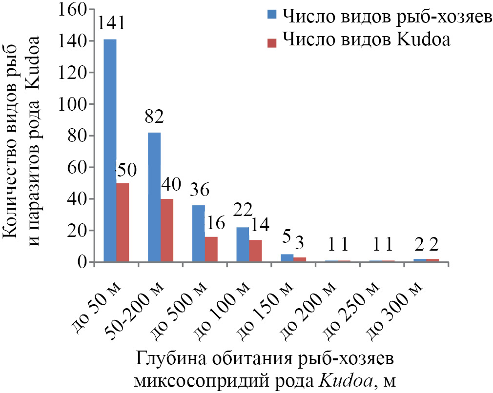 Рис. 1. Количество видов рыб-хозяев и миксоспоридий рода Kudoa, приуроченное к глубинам обитания хозяев.