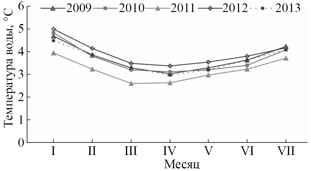Рис. 1. Температура воды прибрежной ветви Мурманского течения в январе – июле 2009–2013 гг. (по Карсаков и др., 2022).