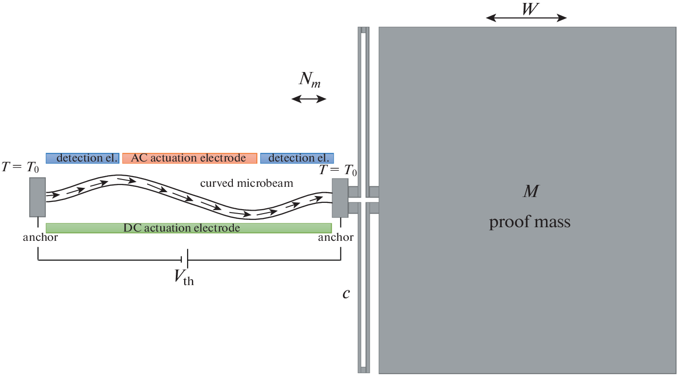 Настоящее исследование посвящено математическому моделированию предложенной новой архитектуры микроэлектромеханического модально-локализованного датчика ускорений (МЭМС-акселерометра/гравиметра) с чувствительным элементом в виде защемленной с двух концов микробалки с начальной погибью, выполненной по форме первой несимметричной моды свободных колебаний. В работе показано, что при несимметричной форме начальной погиби в области положительных осевых усилий существуют зоны близости частотных ветвей, соответствующих второй симметричной и первой несимметричной формам колебаний. При конструкционном обеспечении требуемого значения осевого растягивающего усилия в микробалке этот эффект может быть использован, в частности, для измерения осевой компоненты переносного ускорения по принципу амплитудной модальной локализации. Предусмотренная в компоновке датчика возможность нагрева чувствительного элемента с помощью протекающего по микробалке электрического тока позволяет управлять рабочей точкой режима колебаний и, таким образом, в весьма широких пределах варьировать диапазон измеряемых ускорений и степень чувствительности датчика. Предложенная в статье конфигурация электродов возбуждения колебаний и съема выходного сигнала позволяет, с помощью контура обратной связи, стабилизировать на требуемом уровне амплитуду колебаний по рабочей (третьей) симметричной форме и, при этом, измерять связанную с изменением величины измеряемой компоненты переносного ускорения амплитуду колебаний по несимметричной форме. Таким образом, в работе предложена и исследована математическая модель оригинального модально-локализованного акселерометра (гравиметра), содержащего единственный чувствительный микробалочный элемент и задействующего эффект обмена энергией между различными его формами колебаний.