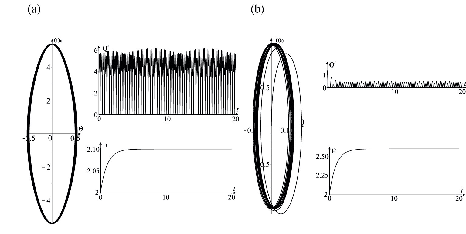 Замечание 3. Отметим, что система (3.5) имеет особенность в точках что является исключительно следствием выбора переменных. Особенность пропадает при движении робота по прямой. Также при свободных колебания маятника проблему можно решить соответствующим выбором начального условия так как характеризует неустойчивое положение маятника. Однако, при управлении сферическим роботом посредством маятникового привода выбор соответствующего начального значения не решит проблему. Поэтому при движении робота по криволинейной траектории имеет смысл интегрировать в исходных переменных.