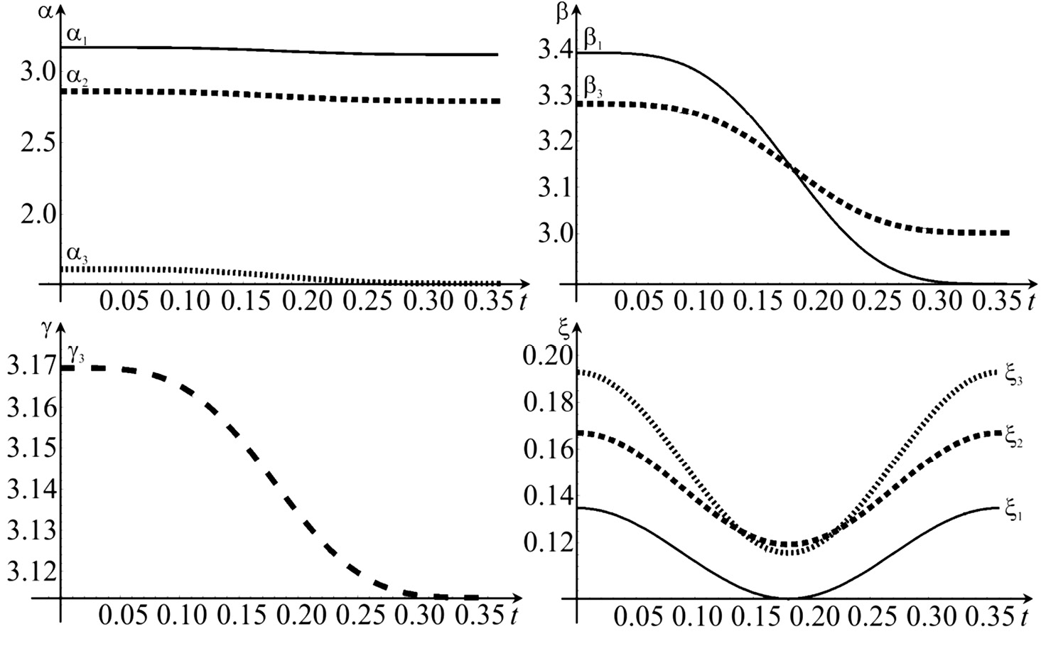 Графики зависимостей первых производных от времени, задаваемых формулами (4.1)–(4.9) представлены на рис. 3.
