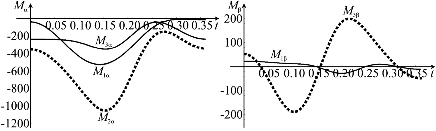 В результате алгебраического решения относительно управляющих моментов и продольных сил системы уравнений движения для рассматриваемой модели (рис. 1) при задании движения выражениями (4.1)–(4.9), найдены зависимости управляющих моментов от времени, представленные на рис. 5. Момент M3γ = 0 во все время движения, т.к. при моделировании тонким стержнем и отсутствии звена сверху не возникает усилий при вращении стержня вокруг продольной оси.