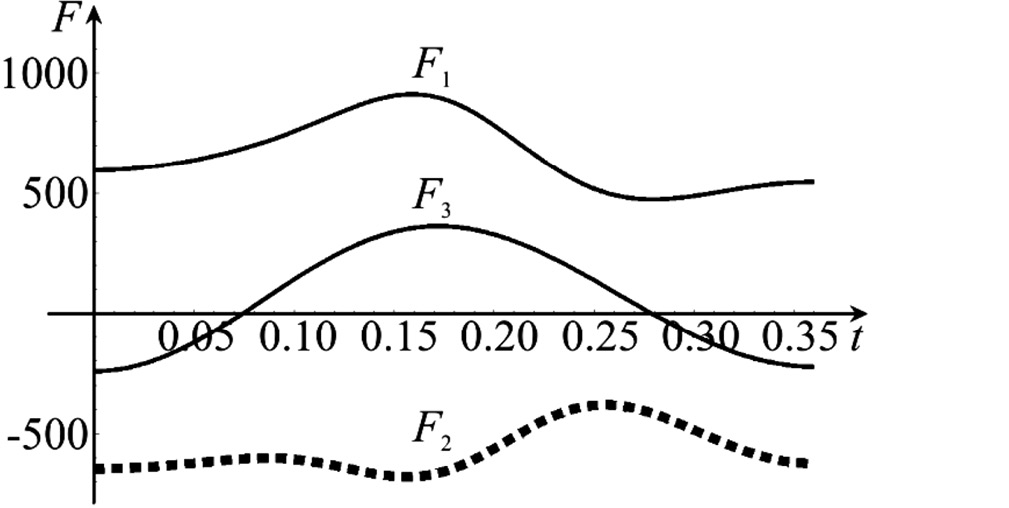 Рис. 6. Зависимости управляющих продольных сил в звеньях экзоскелета от времени.