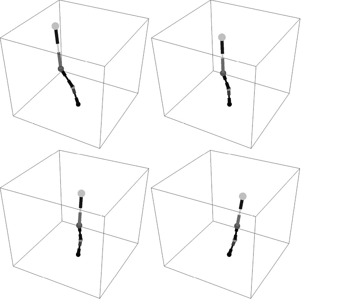 6. Анимационная визуализация движения модели опорной ноги экзоскелета. Для наглядного представления о движении модели полезно строить анимацию движения механизма. Для предложенной модели приведем несколько кадров (рис. 8) из анимационного ролика, в котором механизм движется в соответствии с тем, как заданы изменения углов и длин звеньев формулами (4.1)–(4.9).