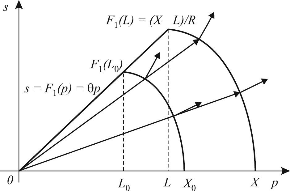 где – коэффициент сцепления, – угол внутреннего трения и R – суть положительные константы, а L > 0 – внутренняя переменная, задающая центр эллипса, X = X(L) – функция, значение которой задает точку на оси p, в которой эту ось пересекает крышка (рис. 1). Уравнение