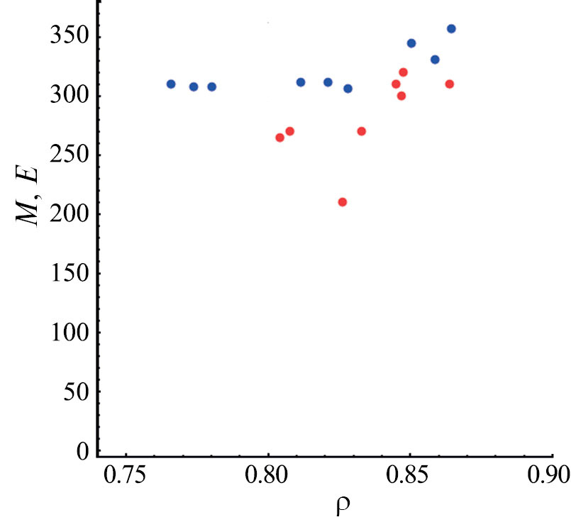 Рис. 5. Упругие модули при свободном (красный) и стесненном (синий) сжатии в зависимости от плотности. По вертикальной оси отложены МПа, по горизонтальной – г/см3