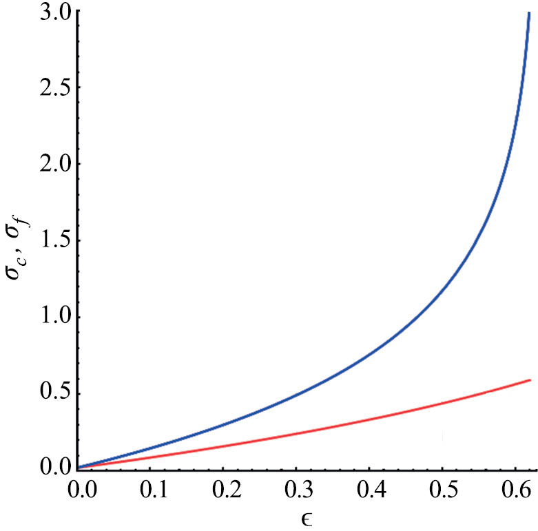 Рис. 7. Кривые упрочнения при свободном (красный) и стесненном (синий) сжатии, описываемые моделью. По вертикальной оси отложены МПа