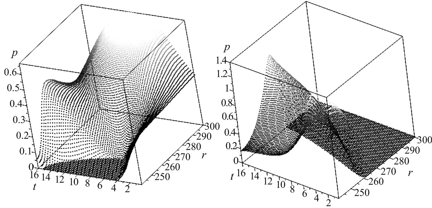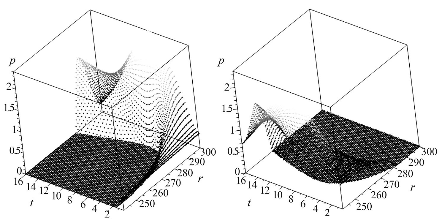 Рис. 2. Зависимость контактных давлений p(r, t) (МПа) от радиальной координаты r (мм) и временной координаты t (с) для первого (слева) и второго (справа) последовательных торможений с учетом наличия поверхностной пленки