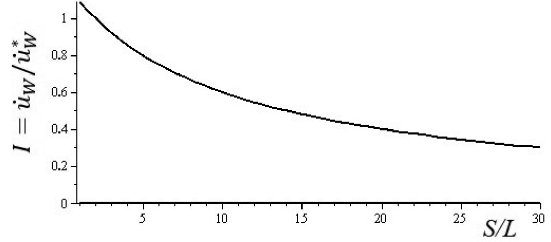Рис. 9. Зависимость отношения интенсивности изнашивания с учетом пленки к интенсивности изнашивания без учета пленки () от геометрического параметра контакта S/L (мм)