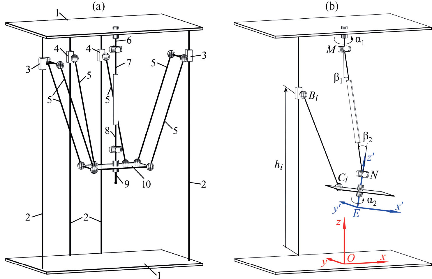 Введем систему координат Ex′y′z′, связанную с подвижной платформой в точке, которая совпадает с точкой E выходного звена (рис. 2, b), так что системы координат Oxyz и Ex′y′z′ имеют одинаковую ориентацию при φy = 0. Обозначим x′Ci, y′Ci и z′Ci координаты центра сферического шарнира платформы (точка Ci) в этой системе координат (для кинематических цепей с параллелограммами мы можем выбрать Ci как среднюю точку между смежными сферическими шарнирами). Мы можем вычислить координаты xCi, yCi и zCi той же точки относительно системы координат Oxyz следующим образом: