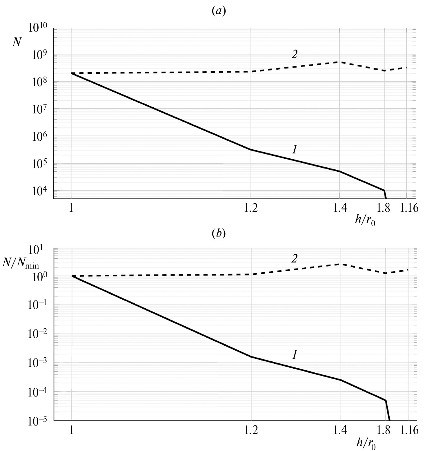 На рис. 10, a представлены графики (пунктиром) для количества циклов N0 до зарождения трещины на образце с остроугольной насечкой (нулевой радиус закругления) при измельчении сетки от размера r0 до размера r0/16, построенные по результатам расчетов с осреднением повреждаемости. На рис. 10, b эти же графики нормализованы – отнесены значению N0 при h/r0 = 1.