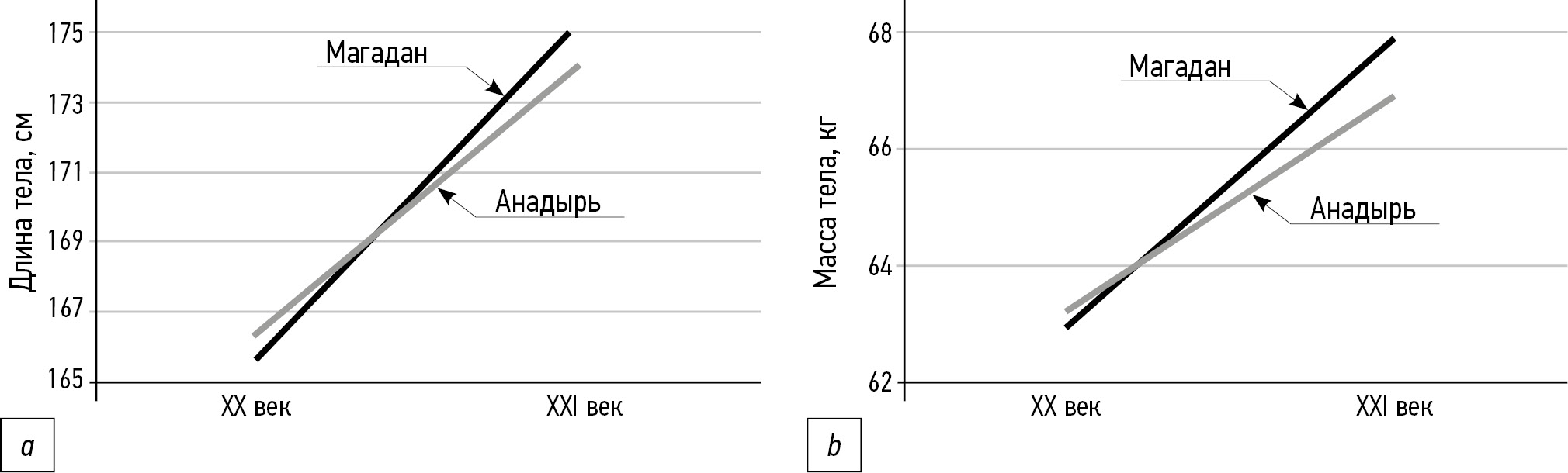 Основные антропологические характеристики (длина, масса тела и тип телосложения) — это адаптивные признаки, существенно различающиеся у населения различных климатогеографических областей [1]. В настоящее время в работах иностранных авторов параметры физического развития (в частности, длина тела) используются как показатели качества питания и даже уровня жизни [2, 3]. Приспособление организма к факторам внешней среды — длительный исторический процесс, направленный на формирование экологического типа, который обеспечивает целостность и оптимальные условия жизнедеятельности [4]. Приобретение устойчивости к действию экстремальных климатогеографических условий у коренных малочисленных народов Севера сопровождалось формированием необратимых конституционально-морфологических изменений, которым дали следующие названия: эколого-физиологический портрет [4], арктический адаптивный тип [1]. В последние десятилетия произошли существенные социально-экономические изменения на территории Северо-Востока России, которые могли сказаться на морфологических показателях аборигенного населения. Это может быть следствием процессов акселерации (секулярного тренда), охватывающих различные популяции в современном мире. Секулярный тренд — важное биологическое явление, находящееся под влиянием социально-экономического развития, наблюдается как в развитых, так и развивающихся странах начиная с XIX века [5–8]. Секулярный тренд длины тела демонстрирует схожую картину во всем мире, хотя возникновение и скорость развития тренда варьируются [9]. Такие долговременные изменения морфофункциональных характеристик отмечаются также у населения приарктических и северных регионов [10, 11].