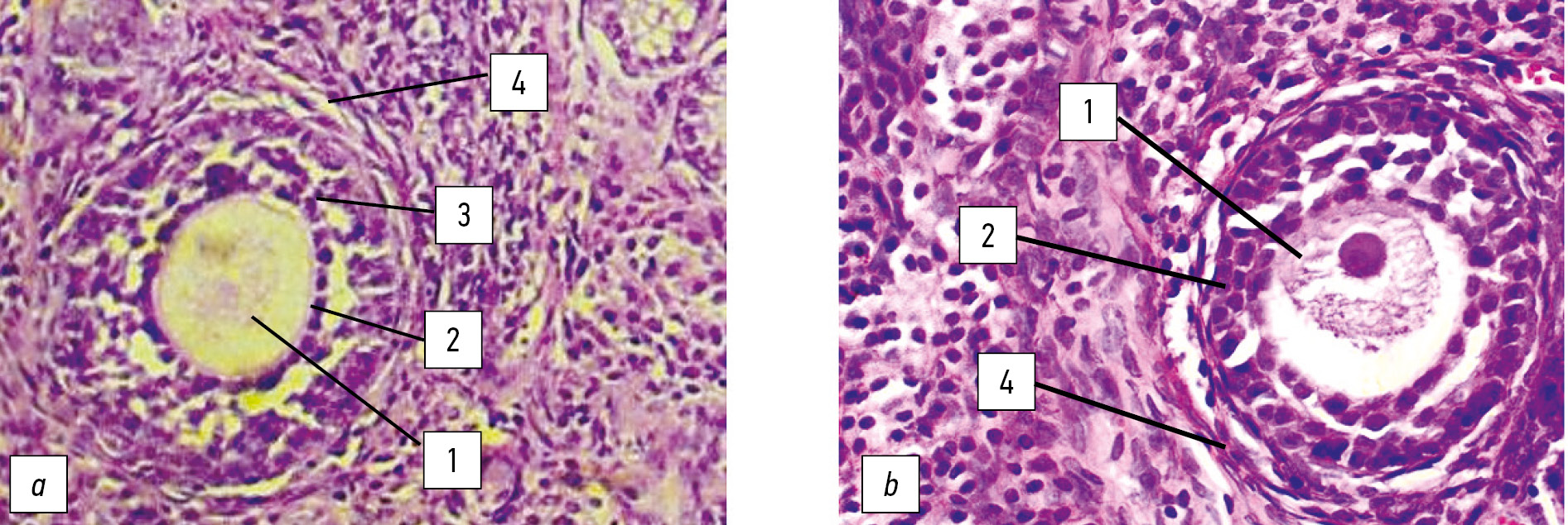 Рис. 2. Вторичные фолликулы яичника крысы линии WAG/Rij, определяется истончение блестящей оболочки (a) и отсутствие блестящей оболочки (b): 1 — ооцит, 2 — блестящая оболочка, 3 — гранулёзные клетки, 4 — тека. Окраска гематоксилином и эозином. Об. ×10, ок. ×40. / Fig. 2. Secondary ovarian follicles of the WAG/Rij rat line, thinning of the zona pellucida (a) and absence of the zona pellucida (b) are determined: 1 — oocyte, 2 — zona pellucida, 3 — granulosa cells, 4 — theca. Stained with hematoxylin and eosin. Lens ×10, ocular ×40