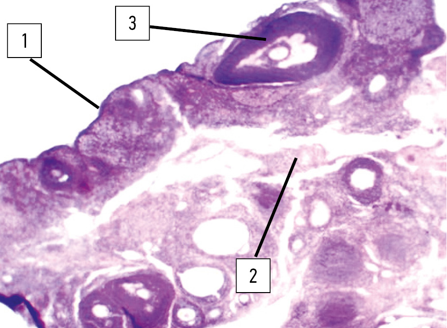 Рис. 3. Общий план строения яичника крысы линии WAG/Rij: 1 — корковое вещество, 2 — мозговое вещество, 3 — зрелый фолликул. Окраска гематоксилином и эозином. Об. ×4, ок. ×10. / Fig. 3. General plan of the structure of the ovary of a WAG/Rij rat: 1 — cortical substance, 2 — medulla, 3 — mature follicle. Stained with hematoxylin and eosin. Lens ×4, ocular ×10.