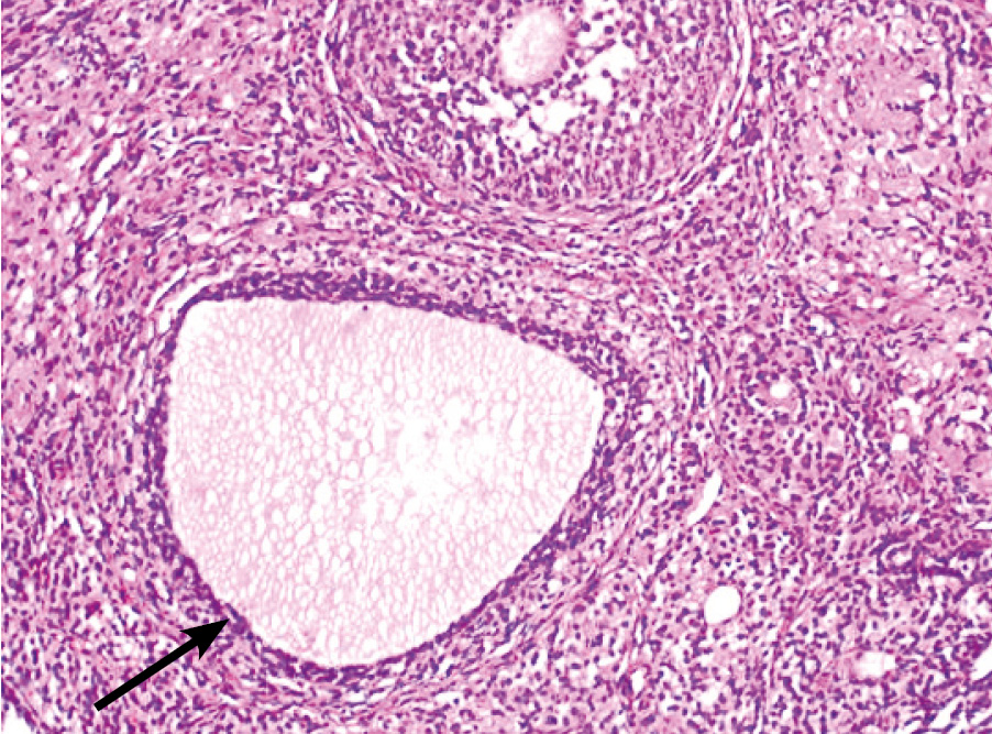 Рис. 4. Кистоподобное образование в яичнике крысы линии WAG/Rij (стрелка). Окраска гематоксилином и эозином. Об. ×10, ок. ×10. / Fig. 4. Cyst-like formation in the ovary of a WAG/Rij rat (arrow). Stained with hematoxylin and eosin. Lens ×10, ocular ×10.