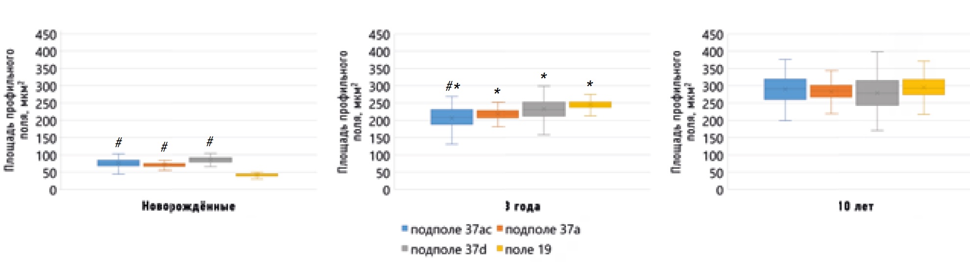 В разных корковых зонах у новорождённых и трёхлетних детей среднегрупповые показатели ПН в слое III имели значимые различия. У новорожденных размеры ПН в подполях ТРО были статистически значимо больше по сравнению с полем 19 затылочной области коры. У трёхлетних детей подполе 37ас по величине ПН уступало полю 19. После 3 лет межзональные различия между среднегрупповыми показателями ПН сглаживались (рис. 2; см. рис. 1).