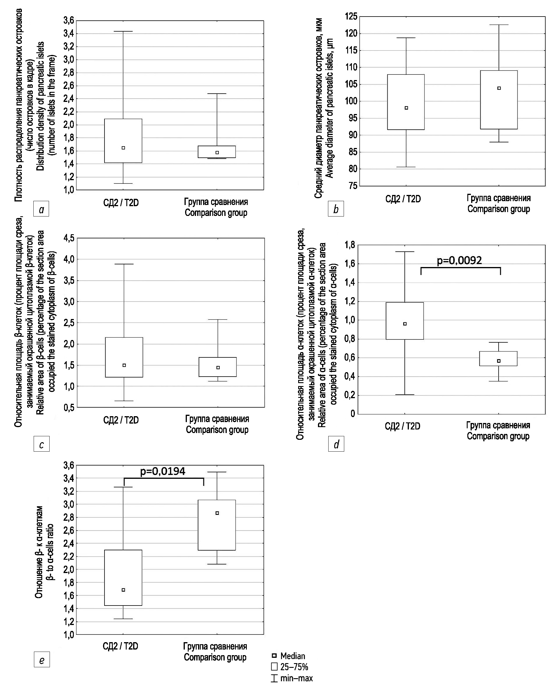 Fig. 3. Characteristics of the endocrine pancreas in T2D and comparison groups: a — distribution density of islets (number of islets in the frame); b — average diameter of islets, µm; c — relative area of β-cells (percentage of the section area occupied by the stained cytoplasm of β-cells); d — relative area of α-cells (percentage of the section area occupied by the stained cytoplasm of α-cells); e — β- to α-cells ratio. Significant differences between groups (Mann–Whitney U-test) are marked by square bracket and p-value