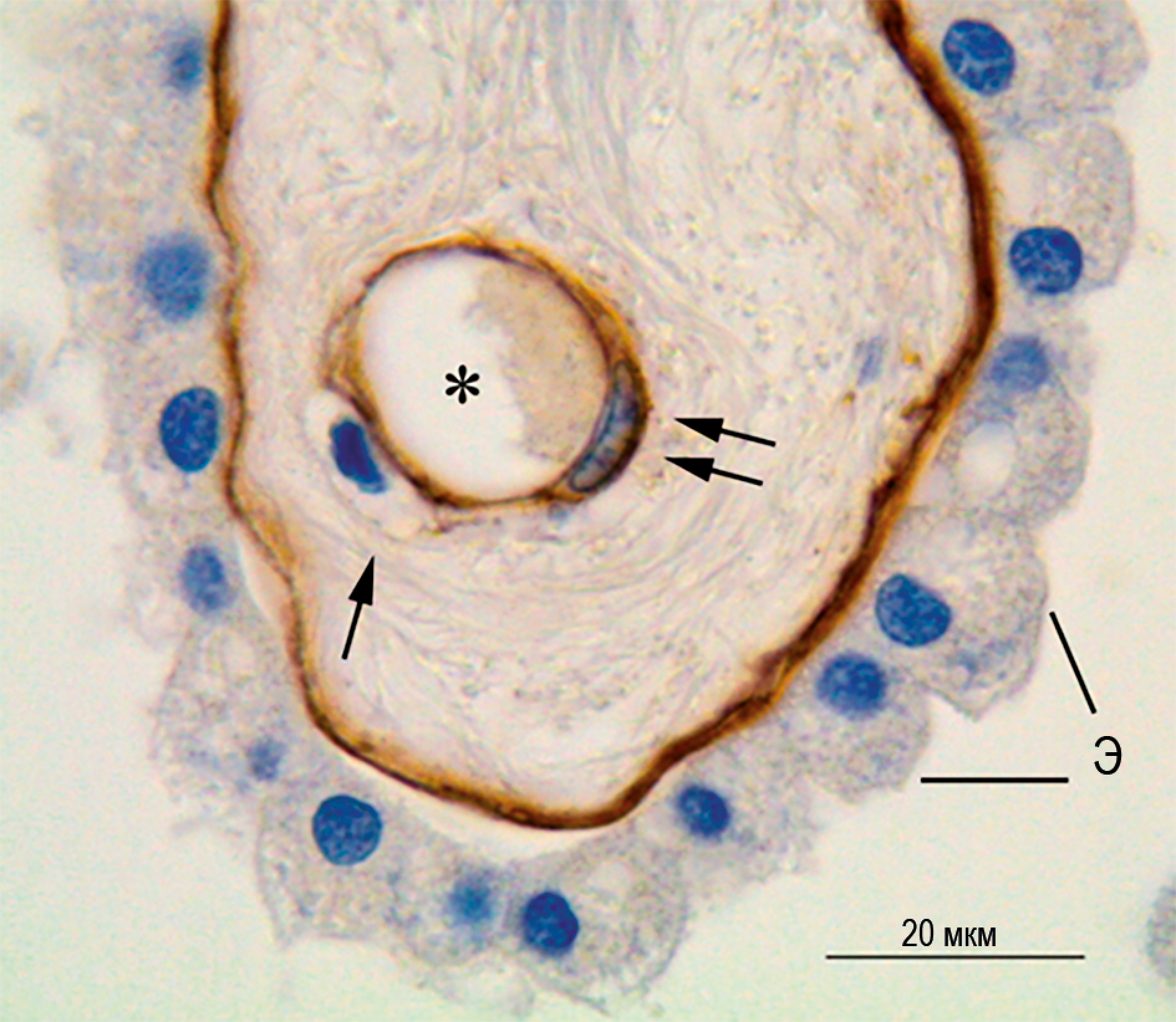Рис. 4. Кровеносный сосуд (капилляр) в строме сосудистого сплетения: стрелкой указана периваскулярная клетка, двойной стрелкой ― перицит, звёздочкой отмечен просвет кровеносного сосуда; Э ― эпителиоциты ворсинки. Иммуногистохимическая реакция на коллаген IV типа. Докраска гематоксилином.