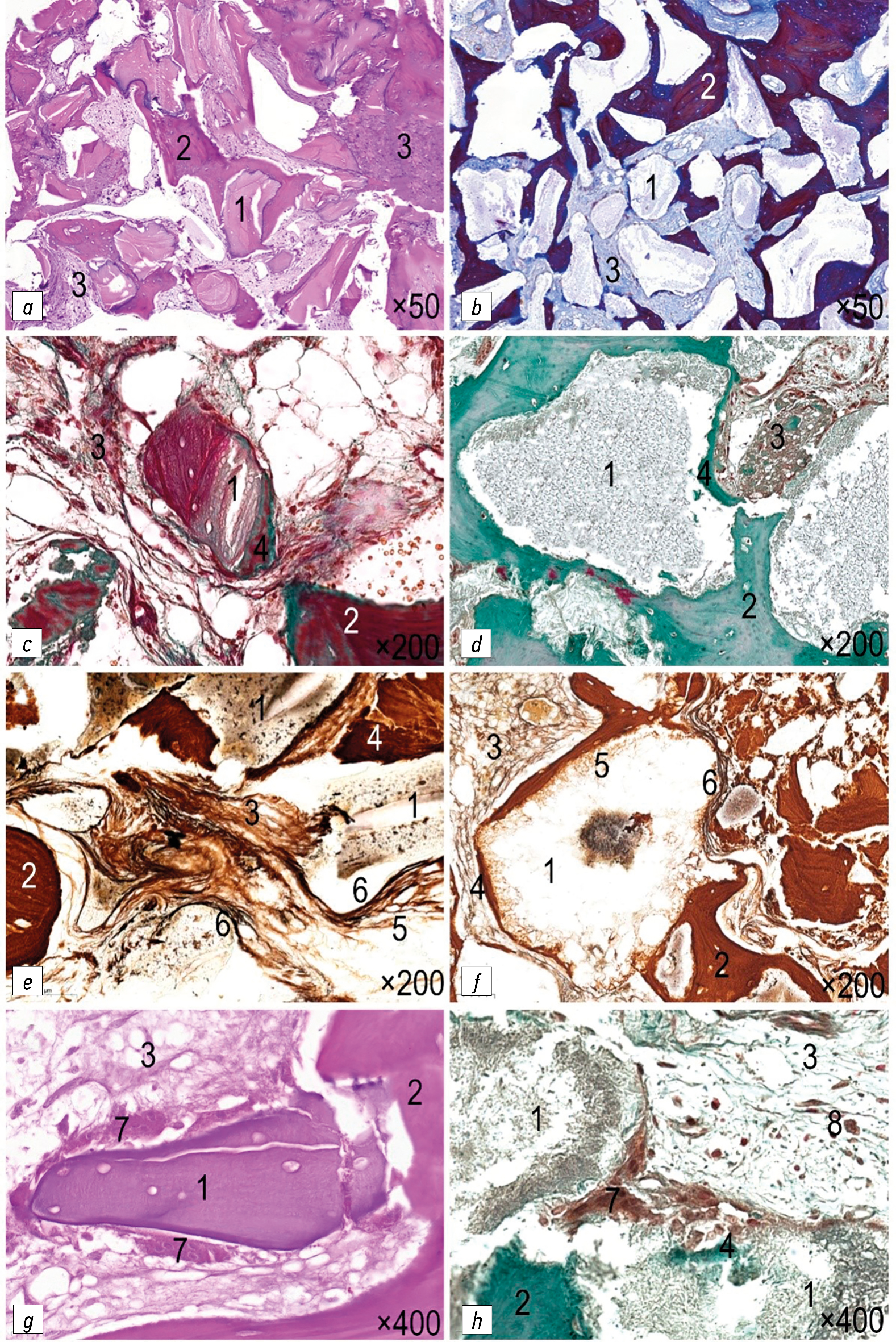 Рис. 2. Особенности костного регенерата при использовании ксеногенного костного матрикса (левый столбец) и ген-активированного материала (правый столбец): 1 — фрагменты остеопластического материала; 2 — вновь образованная костная ткань; 3 — соединительная ткань с разной степенью упорядоченности коллагеновых волокон; 4 — остеоид; 5 — коллагеновые волокна (коричневые); 6 — аргирофильные волокна (чёрные); 7 — многоядерные клетки, резорбирующие материал; 8 — макрофаги. Окраска: a, g — гематоксилин и эозин; b — трихром по Маллори; c, d, h — трихром по Массону–Голднеру; e, f — импрегнация нитратом серебра.