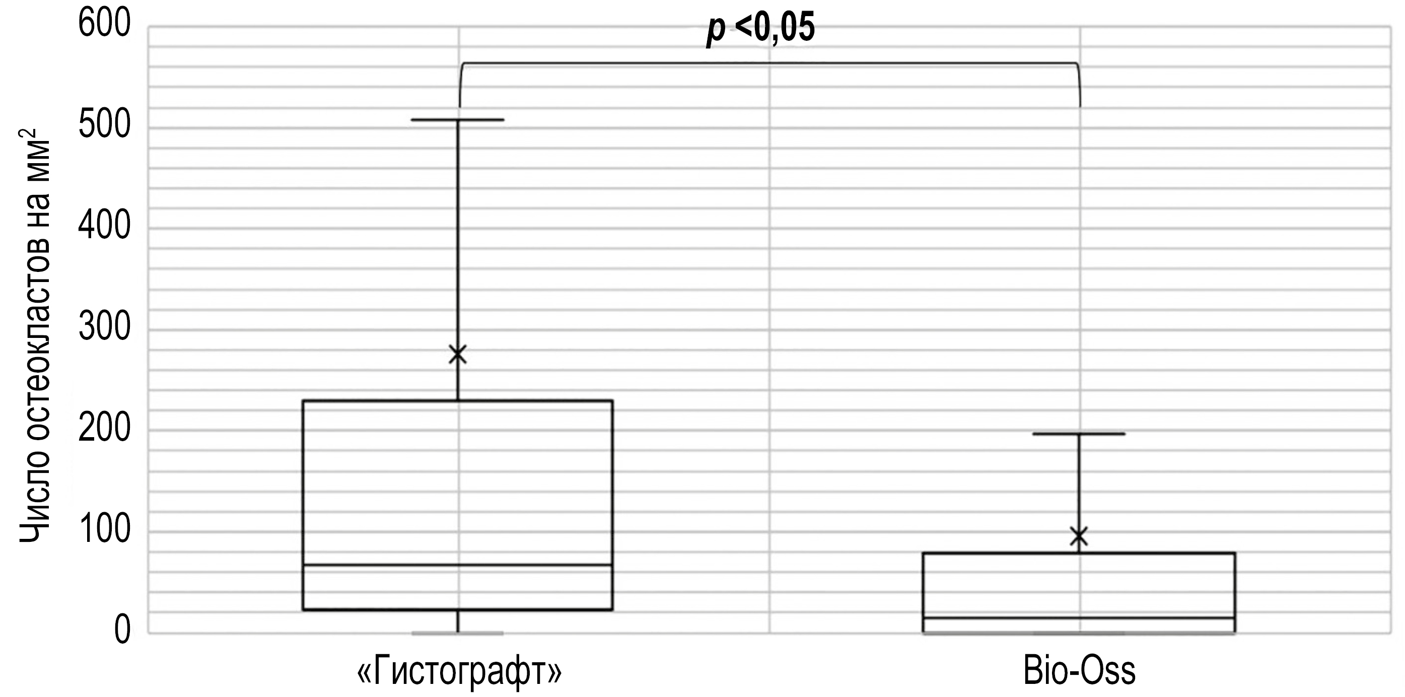 Рис. 6. Индекс остеокластов через 6 мес после имплантации: Bio-Oss — ординарные изделия на основе ксеногенного костного матрикса; «Гистографт» — ген-активированные синтетические изделия на основе октакальциевого фосфата.