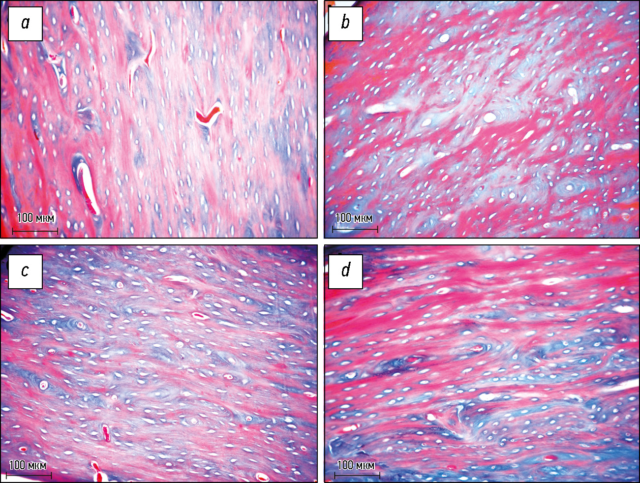 Fig. 6. A section through the diaphysis of femur: a, c — intact bone; a — rabbit from group 1; c — rabbit from group 2; b, d — diaphysis of rabbit bone after heating at a temperature of 55–60 ℃ in the medullary canal; b — rabbit from group 1 three days after heating; d — rabbit from group 2 seven days after heating; a–d — bone plates of compact bone substance with clear boundaries, fibrous components of osteoid tightly adhering to each other. Mallory staining, magnification ×200.
