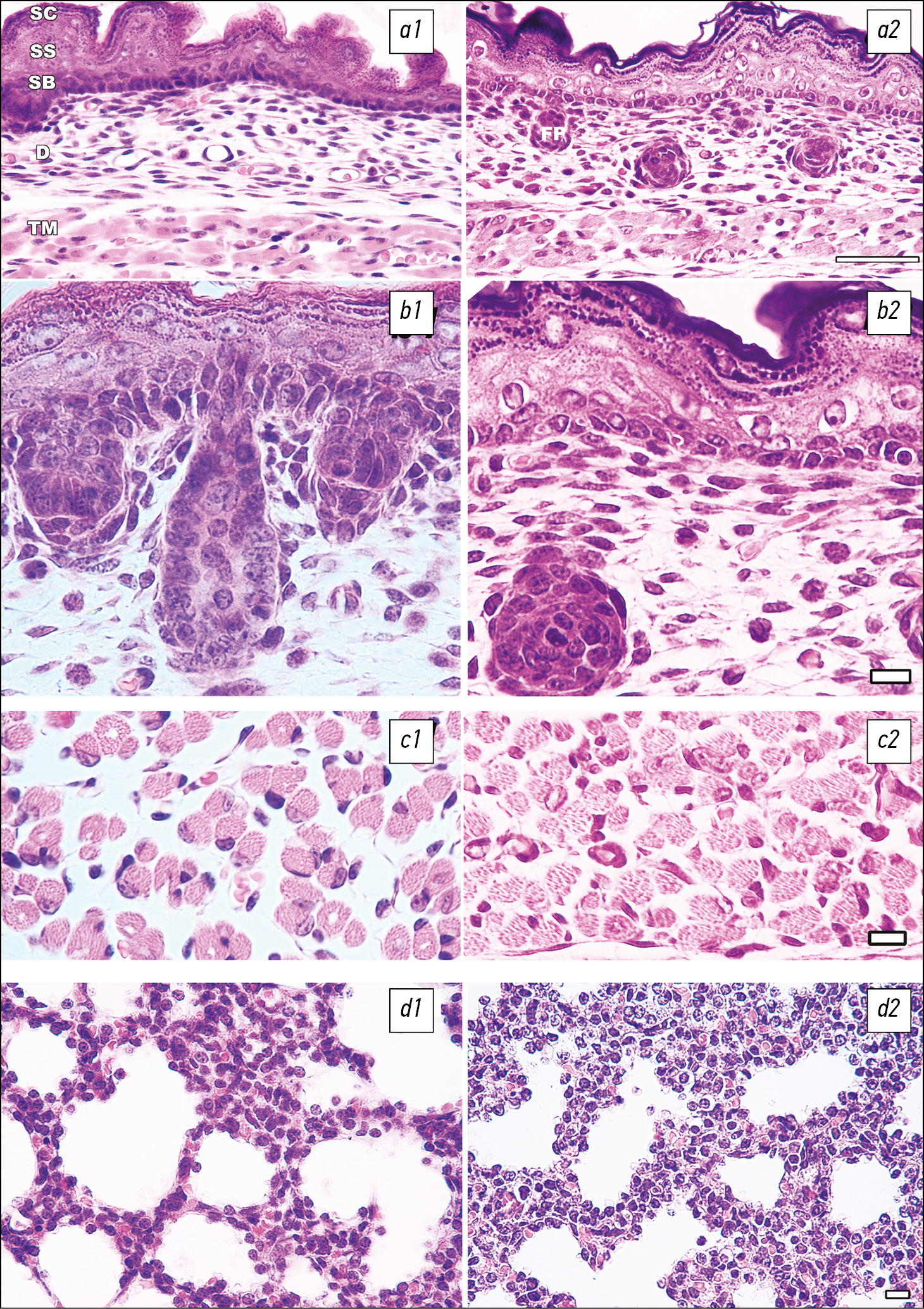 Рис. 1. Срезы эмбрионов мыши (19-й день внутриутробного развития). Левый столбец — проводка образца в полиэтиленгликоль; правый столбец — проводка образца в парафин; a1, a2, b1, b2 — эпидермис и дерма. SC — stratum corneum, роговой слой эпидермиса; SS — stratum spinosum, шиповатый слой эпидермис; SB — stratum basale, базальный слой эпидермиса; D — dermis, дерма; FP — folliculus pili, волосяная луковица; TM — textus muscularis, мышечная ткань. c1, c2 — мышечная ткань, musculus erector spinae; d1, d2 — ткань лёгкого. Масштабная шкала: a, b — 100 мкм; c,d — 20 мкм. Съёмка всех микрофотографий выполнена при одинаковых настройках микроскопа и камеры.