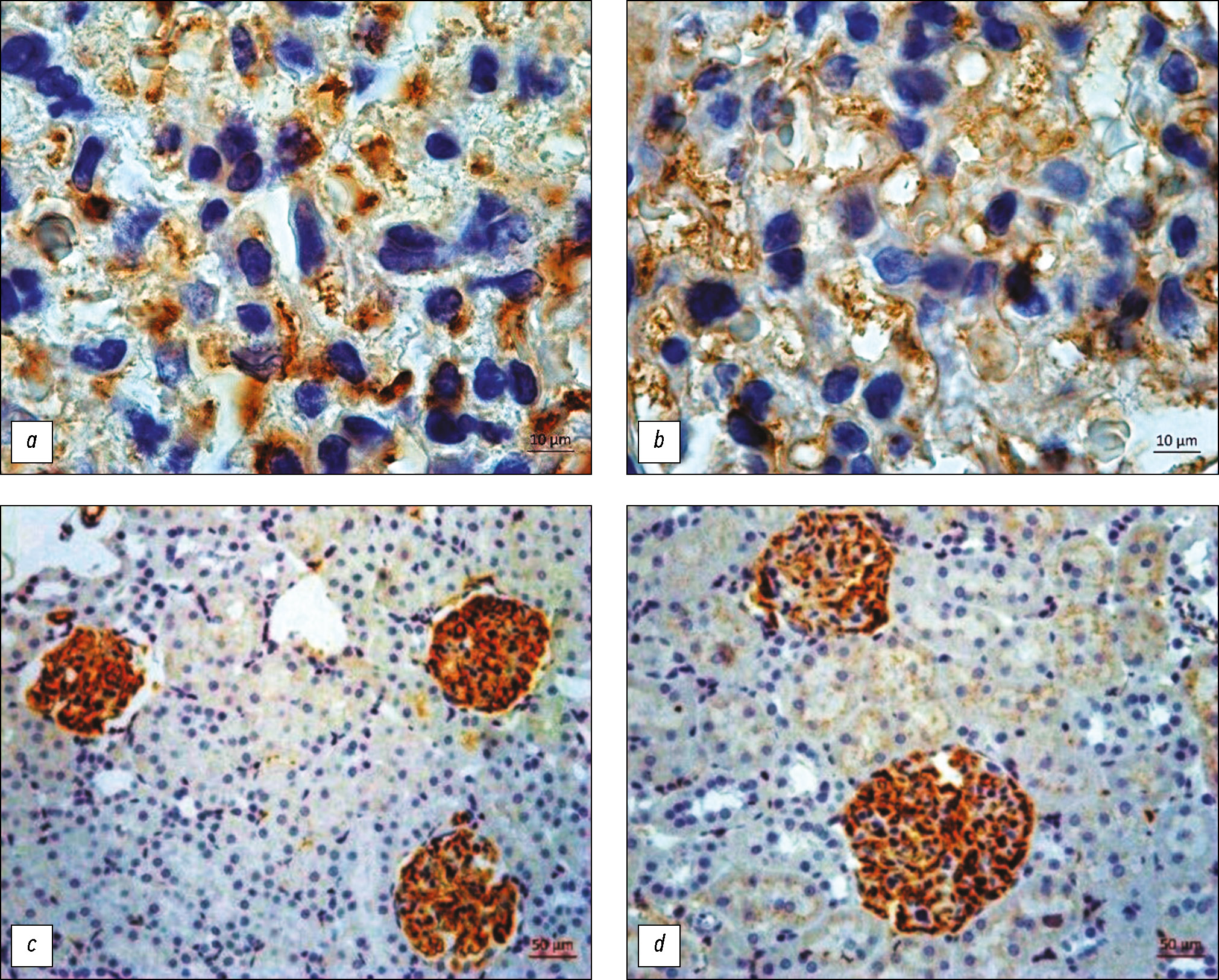 Fig. 2. Capillaries of the glomerular tuft in intracortical nephrons of rats: a, c, control group; b, d, after paraoxon exposure (model 1). Immunohistochemical staining with antibodies to: a, b, nephrin, 3 days after paraoxon exposure; c, d, type IV collagen, 7 days after paraoxon exposure; counterstained with Mayer hematoxylin. Magnification: a, b, ×1000; c, d, ×400.