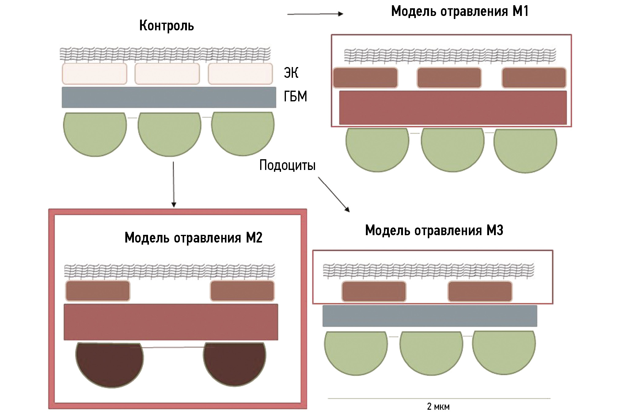 Рис. 3. Схема гломерулярного фильтрационного барьера почек у крыс в трёх экспериментальных моделях отравления параоксоном: рамкой выделены элементы гломерулярного фильтрационного барьера, в которых обнаруживаются изменения спустя 7 суток после острого воздействия параоксона. Толщина рамки в модели М2 подчёркивает выраженность изменений, охватывающих все элементы гломерулярного фильтрационного барьера.