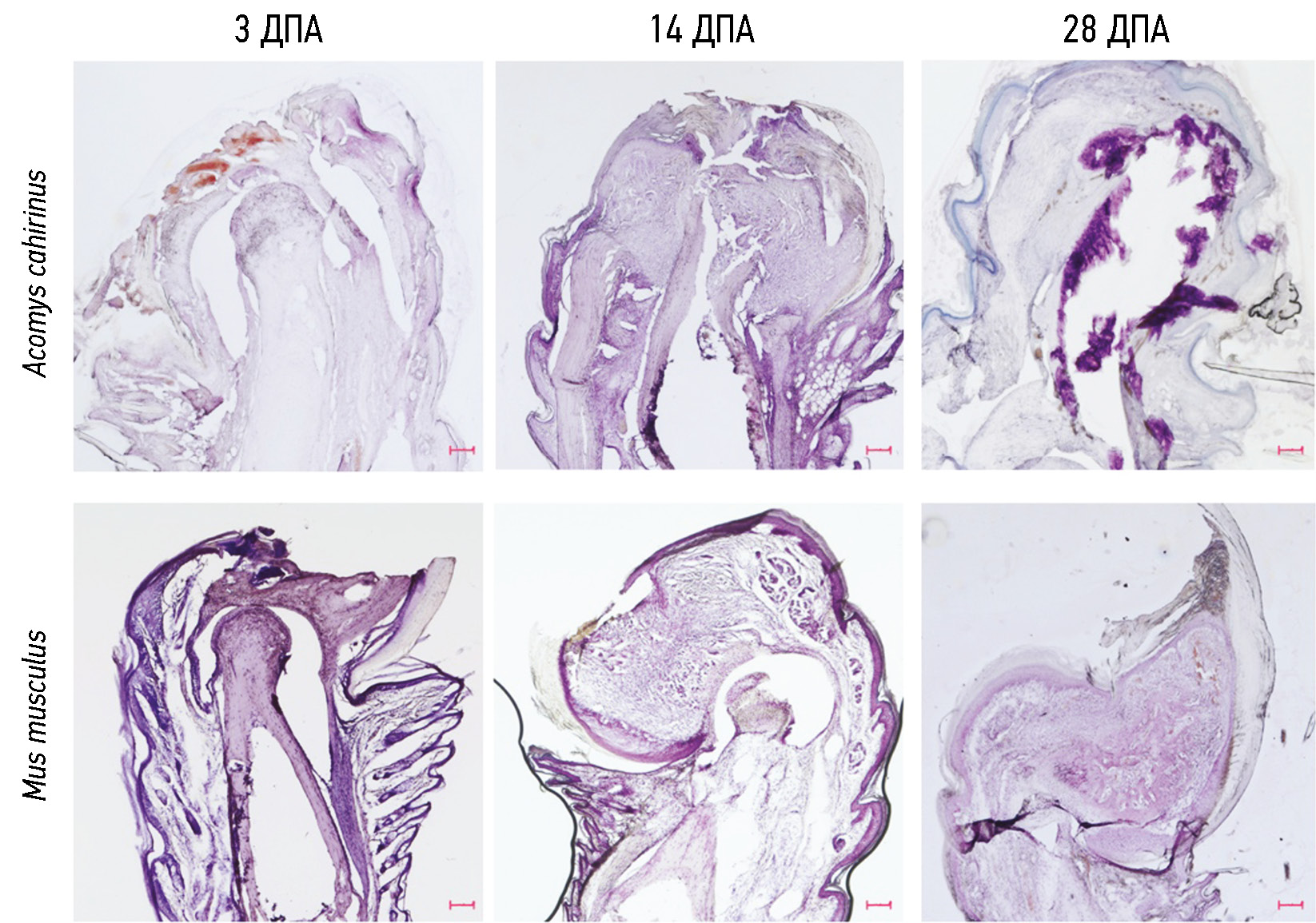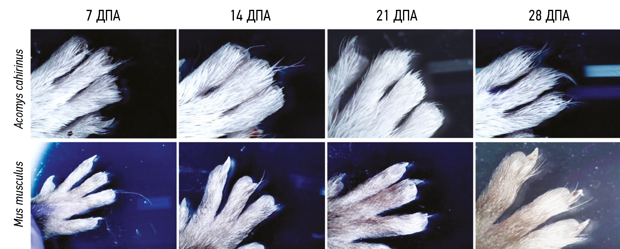 После ампутации фрагмента концевой фаланги пальца дистальнее ногтевого ложа у M. musculus процесс заживления протекает в соответствии с классическими стадиями и этапами, описанными ранее: закрытие раневой поверхности, формирование бластемы с дальнейшим полным или частичным восстановлением всех структур кончика пальца вплоть до отрастания ногтя к 28 дню (риc. 1). У A. cahirinus после ампутации заживление происходит по иному сценарию: закрытие раны занимает больше времени и даже к 14-му дню после ампутации (ДПА) сохраняется незатянувшаяся рана (см. рис. 1). В более поздние сроки у иглистых мышей наблюдается укорочение повреждённых пальцев и их деформация по типу «барабанных палочек». При этом полного восстановления тканевых структур кончика пальца не происходит — при визуальной оценке отсутствует отросший ноготь через 28 ДПА; восстановления длины пальцев не происходит и на более поздних сроках, вплоть до 42 и 56 ДПА (данные не приведены).