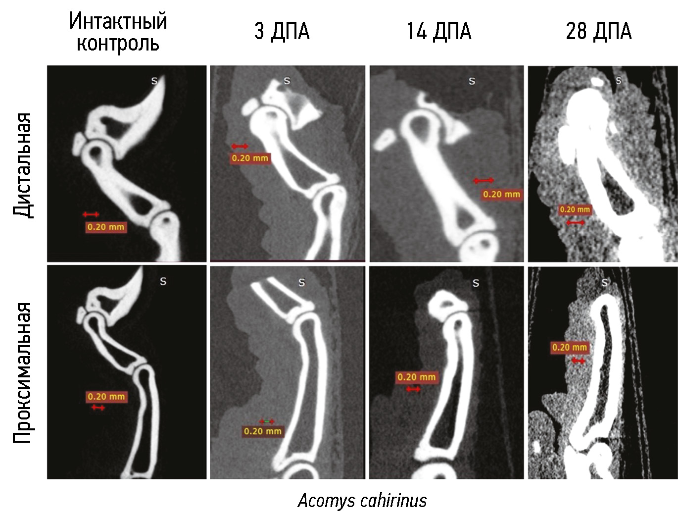 У иглистых мышей деградация костной культи более выражена и происходит вплоть до полного исчезновения кости третьей фаланги (см. рис. 3, рис. 4). Через 28 ДПА на микрокомпьютерной томограмме кость третьей фаланги в большинстве случаев полностью отсутствует (см. рис. 4). При этом отмечается значительное утолщение эпифиза кости второй фаланги (см. рис. 4). Это наблюдение хорошо согласуется с результатами гистологического анализа, который показал формирование новой кости у M. musculus и увеличение объёма существующей кости у A. cahirinus. Кроме того, оценка длины дистальной фаланги после ампутации вплоть до 42 и 56 ДПА (рис. 5) показала, что длина пальцев не увеличивается у A. cahirinus, но не у M. musculus.