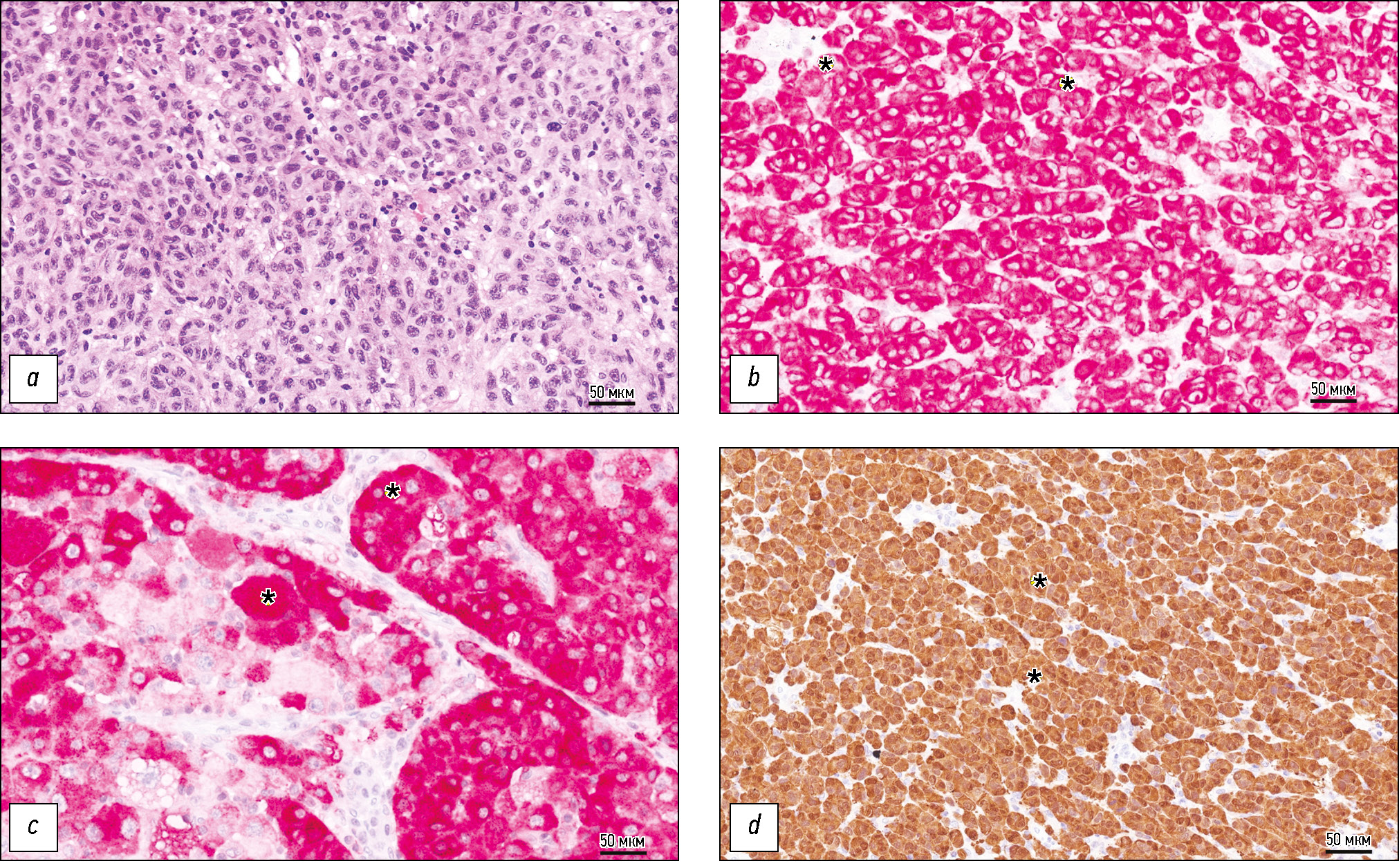 Рис. 2. Узловая меланома кожи (8721/3), толщина по Breslow 4,2 мм (pT4a): a — окрашивание гематоксилином и эозином; b — окрашивание с использованием антител к Melan-A/MART-1, гранулярная цитоплазматическая экспрессия приблизительно 95%; с — окрашивание с использованием антител к HMB-45, цитоплазматическая экспрессия около 75%; d — окрашивание с использованием антител к S100, цитоплазматическая экспрессия около 95%.* обозначена экспрессия изучаемых маркеров в атипичных клетках; увеличение ×400.