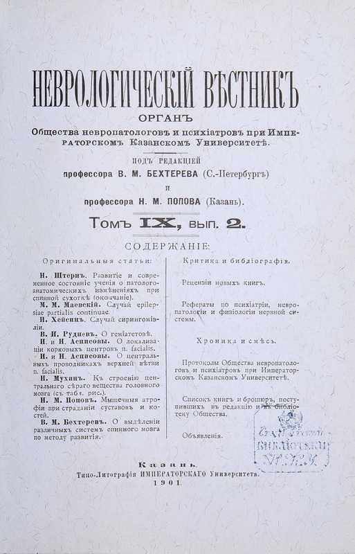 Проф. Н. М. Поповъ. Шесть лекцій о прогрессивномъ параличѣ помѣшанныхъ.—Казань, 1900