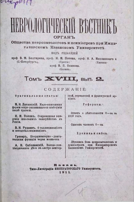 Отчетъ о дѣятельности Общества невропатологовъ и психіатровъ при Императорскомъ Казанскомъ Университетѣ за 1910 годъ