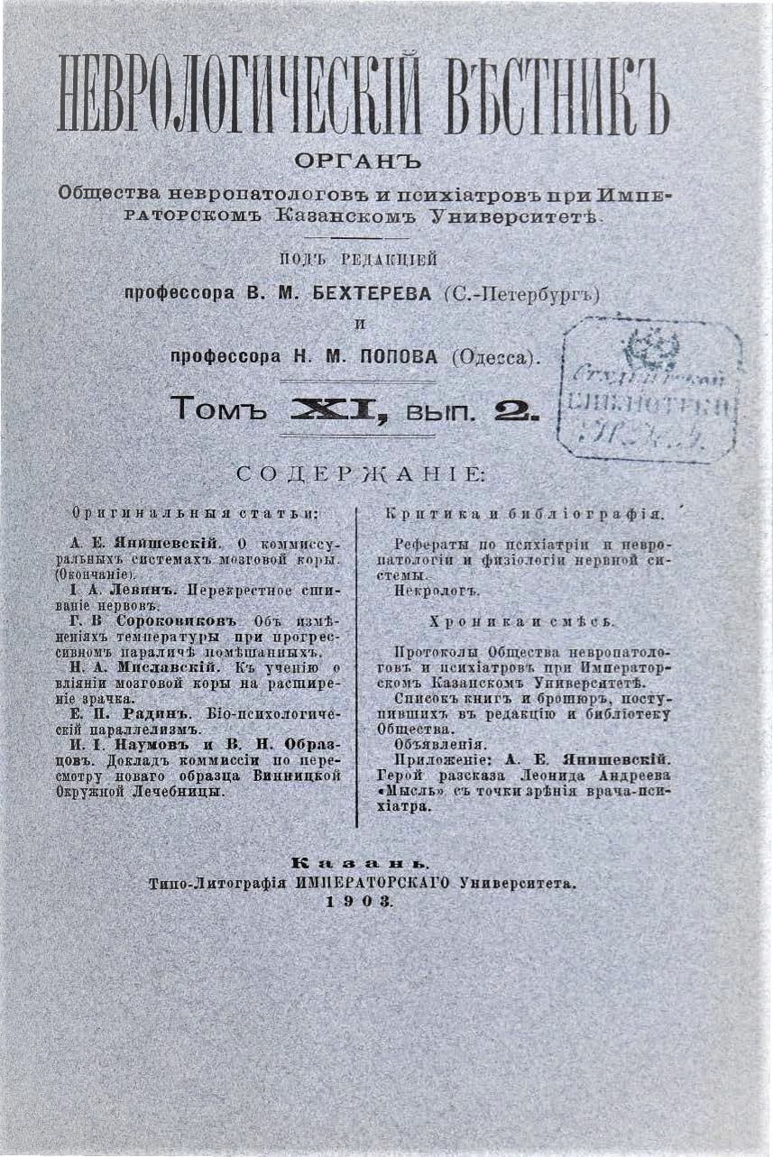 Лѣтопись общества невропатологовъ и психіатровъ при императорскомъ Казанскомъ Университетѣ 1902-3 годѣ