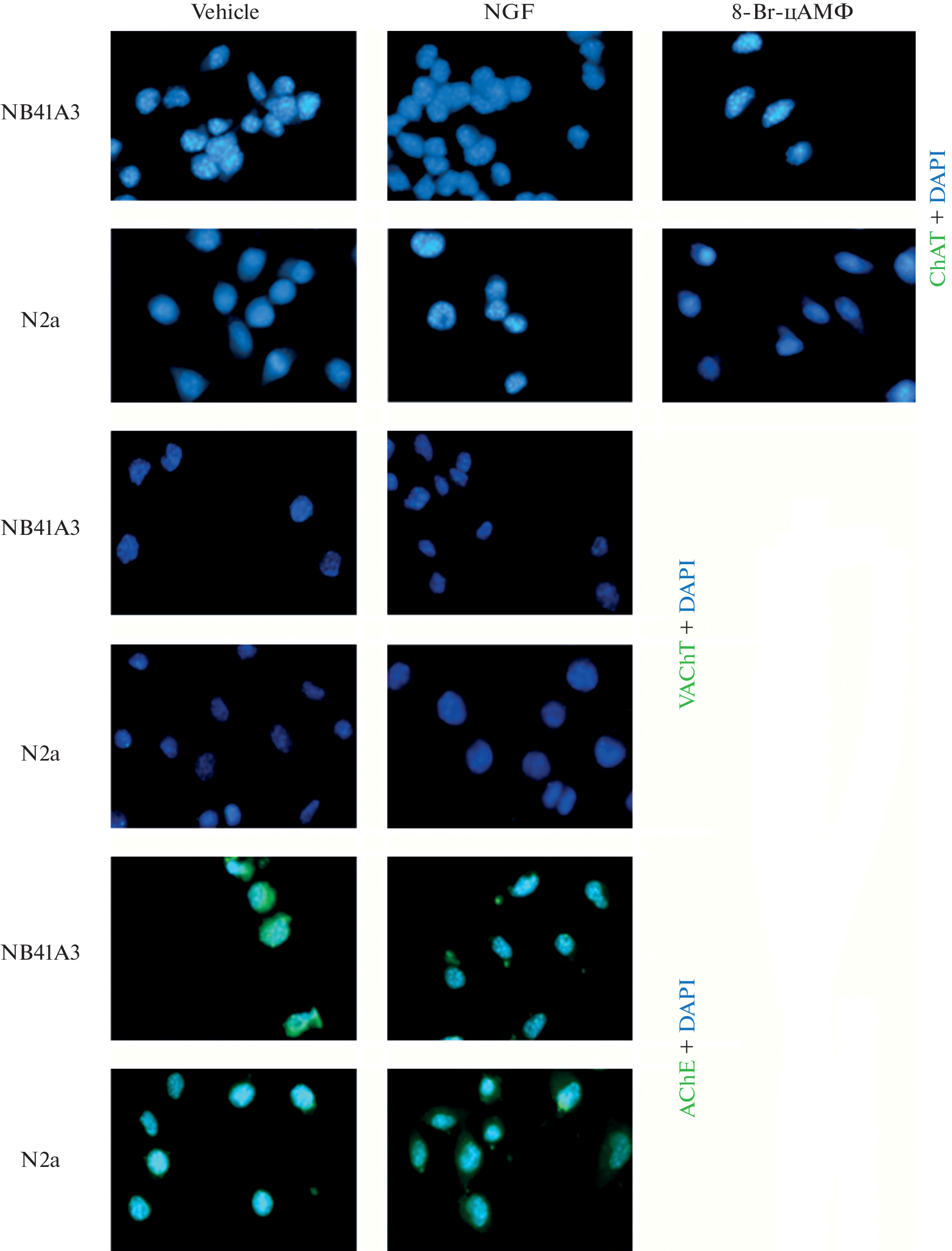 Nerve growth factor (NGF) is a key factor of neuronal differentiation. NGF plays an important role in growth and differentiation of sensory and sympathetic neurons in the peripheral nervous system. In the mature brain, NGF is important for the maintenance of a cholinergic neuronal phenotype. Here, we studied whether NGF is sufficient to induce cholinergic phenotype in murine neuroblastoma cells, which are often used to model various physiological and pathological conditions. We detected expression of both TrkA and p75NGFR of NGF receptors in NB41A3 and Neuro2a neuroblastoma cells, two the most popular cell lines widely used to study the properties of cholinergic neurons in vitro. Treatment of both types of cell cultures with NGF did not induce in contrast to 8-Br-cAMP, which induced differentiation of Neuro2a cells with formation neuron-like morphology. Furthermore, we did not reveal the markers of cholinergic phenotype, such as ChAT or VAChT mRNA or protein in these cells, after NGF treatment. Thus, NB41A3 and Neuro2a cells cannot be used as an in vitro model of cholinergic cells because they do not differentiate and/or exhibit cholinergic phenotype in response to NGF stimulation.