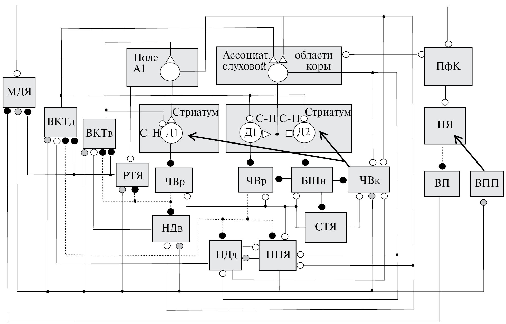 Рис. 1. Схема функциональной организации параллельных нейронных цепей кора — базальные ганглии — таламус — кора, участвующих в восприятии слухо-вербальных галлюцинаций. А1 — первичная слуховая кора; БШн — наружная часть бледного шара; ВКТв и ВКТд — вентральная и дорзальная части внутреннего коленчатого тела соответственно; ВП — вентральный паллидум; ВПП — вентральное поле покрышки; МДЯ — медиодорзальное ядро таламуса; Д1 и Д2 — рецепторы, чувствительные к дофамину; НДв и НДд — вентральная и дорзальная части нижнего двухолмия соответственно; ППЯ — педункулопонтийное ядро; ПФК — префронтальная кора; ПЯ — прилежащее ядро (вентральный стриатум); РТЯ — ретикулярное таламическое ядро; С-Н и С-П — стрионигральные и стриопаллидарные шипиковые нейроны стриатума; СТЯ — субталамическое ядро; ЧВр и ЧВк — ретикулярная и компактная части черного вещества соответственно. Большие светлые и темные кружки — возбудительные и тормозные проекционные нейроны соответственно; маленькие светлые, темные и заштрихованные кружки — возбудительные, тормозные и холинергические синаптические входы соответственно; стрелки — дофаминергический вход; маленькие треугольники и квадраты — потенциированные и депрессированные кортико-стриатные входы соответственно; утолщенные и точечные линии — сильные и слабые входы соответственно.