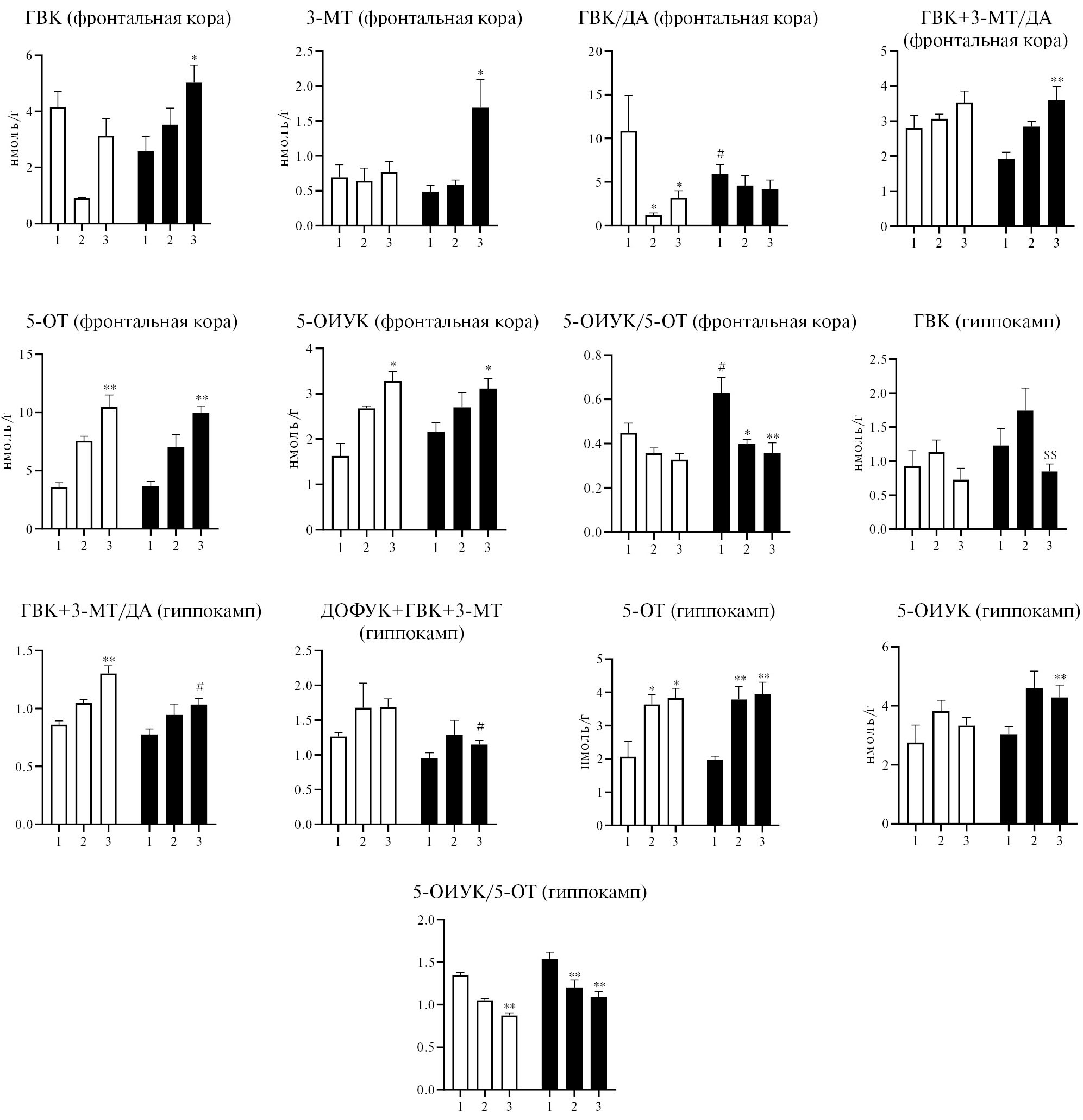 Рис. 2. Динамика изменения метаболизма моноаминов во фронтальной коре и гиппокампе мышей самок линии BALB/C, матерям которых вводили вальпроат натрия (400 мг/кг, п/к). Белый цвет — контроль, черный цвет — вальпроат натрия. Цифрами обозначен возраст животных: 1 — 15 дней, 2 — 42 дня, 3 — 64 дня; * — р < 0.05; ** — р < 0.05; *** — р < 0.05. Данные представлены как M ± SEM, статистический анализ проводили по двухфакторному дисперсионному анализу (факторы: 1) возраст и 2) эффект веществ) с последующим post-hoc-тестом по критерию Ньюмена—Кейлса. Возраст: 1 — 15 дней, 2 — 45 дней, 3 — 65 дней; * — p < 0.05; ** — p < 0.01 по сравнению с тем же веществом у крыс 15-дневного возраста; # — p < 0.05; ## — p < 0.01 по сравнению с контролем того же возраста; $ — p < 0.05; $$— p < 0.01 по сравнению с тем же веществом у крыс 45-дневного возраста.