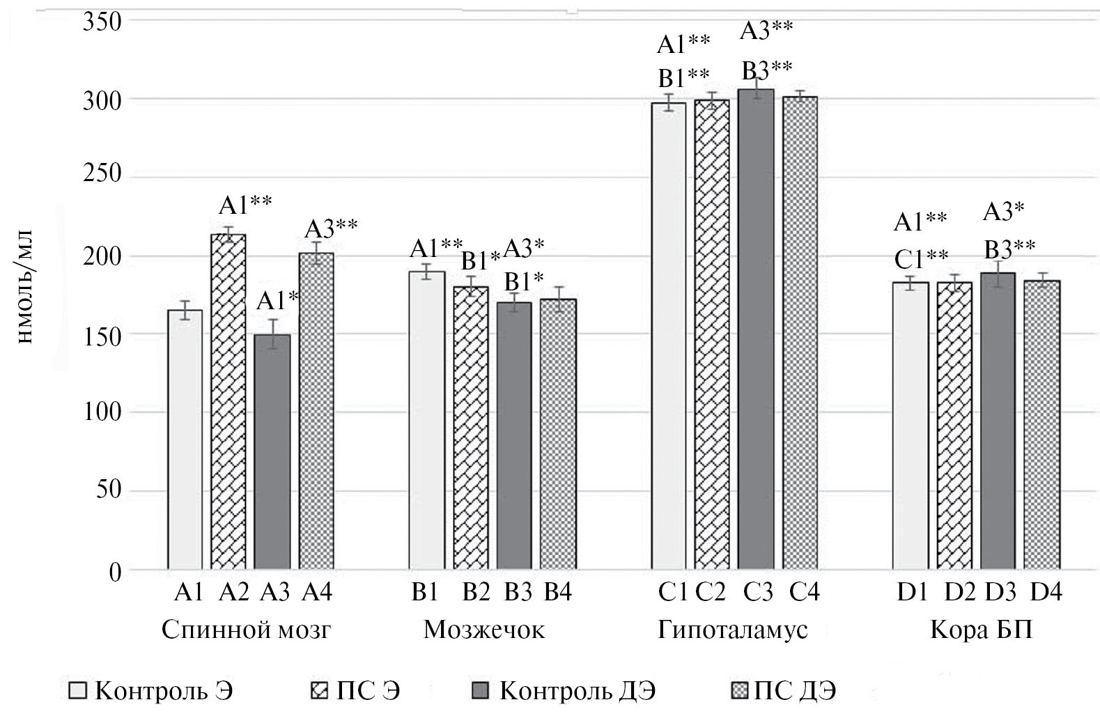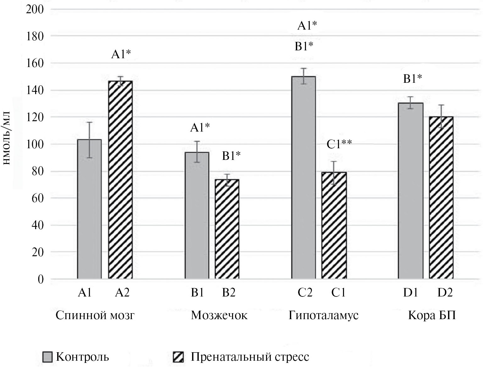 Рис. 1. Уровень NO-метаболитов в отделах мозга пренатально стрессированных самцов крыс, нмоль/мл. Примечание: статистически значимые различия между сравниваемыми группами р < 0.05 – *, р < 0.01 – **, U-критерий Манна – Уитни.