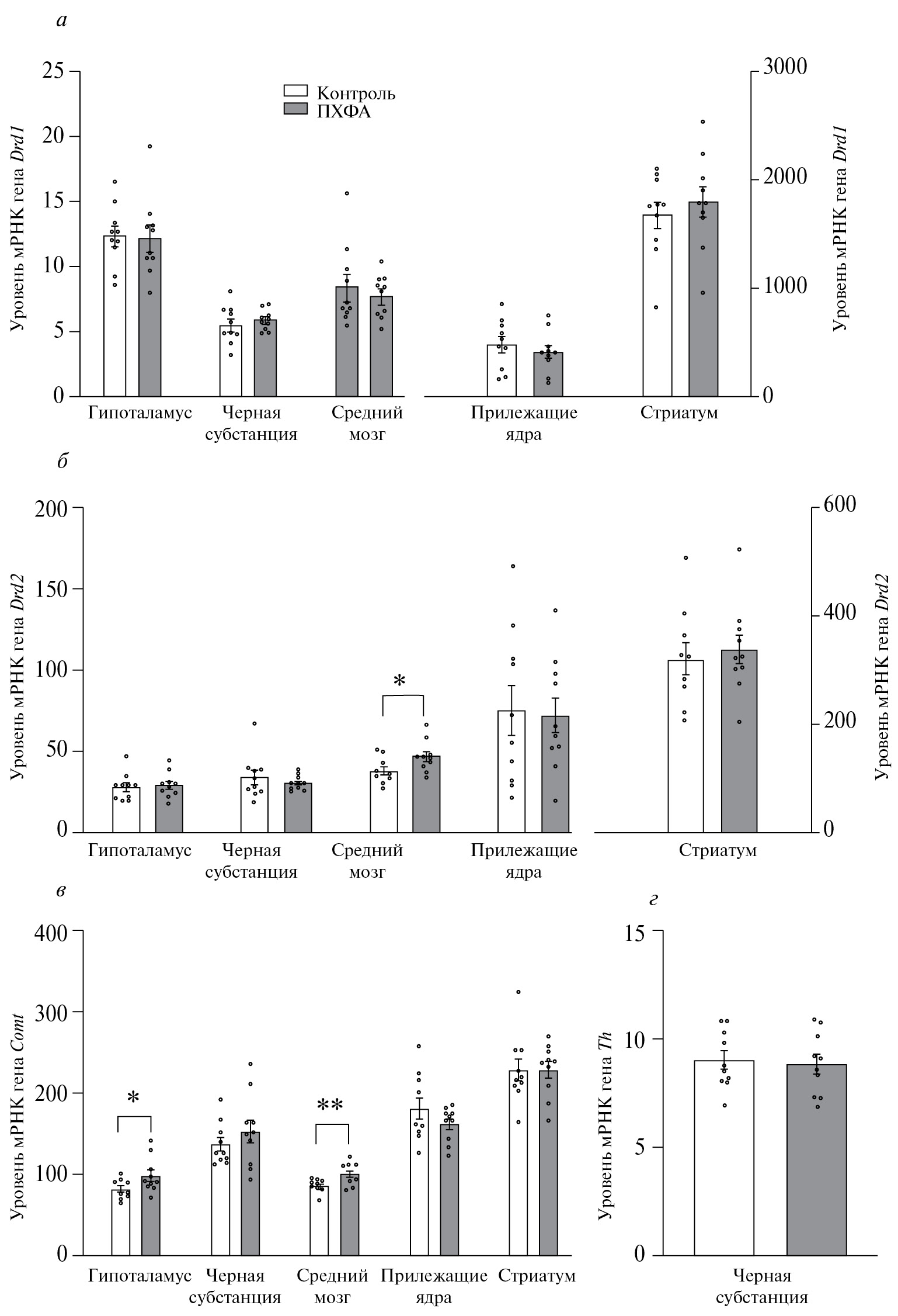 Экспрессия генов в структурах мозга. Введение ПХФА не оказало действия на уровни мРНК гена Drd1, кодирующего дофаминовый рецептор D1, в гипоталамусе (t18 = 0.08, p > 0.05), черной субстанции (t18 = 0.67, p > 0.05), среднем мозге (t18 = 0.61, p > 0.05), прилежащих ядрах (t18 = 0.48, p > 0.05) и стриатуме (t18 = 0.65, p > 0.05) (рис. 2а). Также препарат не повлиял на уровни мРНК гена Drd2, кодирующего дофаминовый рецептор D2, в гипоталамусе (t18 = 0.33, p > 0.05), черной субстанции (t18 = 0.77, p > 0.05), прилежащих ядрах (t18 = 0.18, p > 0.05) и стриатуме (t18 = 0.45, p > 0.05) (рис. 2а). Однако введение ПХФА привело к повышению экспрессии гена Drd2 в среднем мозге (t18 = 2.22, p < 0.05) (рис. 2б). Уровни мРНК гена Comt, кодирующего фермент деградации дофамина КОМТ, увеличились в гипоталамусе (t18 = 2.27, p < 0.05) и среднем мозге (t18 = 2.93, p < 0.01) под действием ПХФА. В то же время препарат не оказал эффекта на экспрессию этого гена в черной субстанции (t18 = 0.97, p > 0.05), прилежащих ядрах (t18 = 1.33, p > 0.05) и стриатуме (t18 = 0.04, p > 0.05) (рис. 2в). Кроме этого, уровни мРНК гена Th, кодирующего фермент синтеза дофамина тирозингидроксилазу, в черной субстанции не различались между группами мышей (t18 = 0.31, p > 0.05) (рис. 2г).