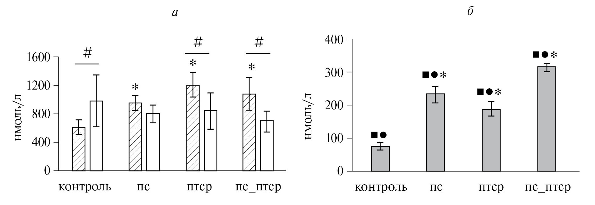 На 20-й день эмбрионального развития у плодов женского пола в мозге уровень первичных продуктов СОМБ в трех исследованных группах очень низкий по сравнению с этим показателем у плодов мужского пола. Однако в группе с сочетанным стрессом этот показатель значительно повышен по сравнению с контролем. Уровень ФОМБ в контрольной группе также низкий, повышается в группе с ПС у матерей, а в группах с моделированием ПТСР у матерей этот показатель повышается в 2–3 раза по сравнению с уровнем ФОМБ в группе с ПС у матерей. Уровень вторичных продуктов СОМБ и ФОМБ не отличается в группах контроля и ПС у матерей, тогда как в группах с моделированием ПТСР у матерей этот показатель почти в два раза превышает уровень группы контроля. Можно заключить, что потомство женского пола на данном сроке эмбрионального развития в группах с моделированием ПТСР у матерей демонстрирует усиление как процессов свободнорадикального окисления в мозге, так и усиление процессов белкового синтеза.